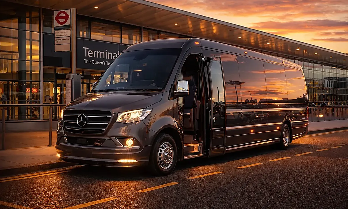 Executive minibus and coach hire with driver. Live flight monitoring, all terminals covered, and door-to-door service across the UK